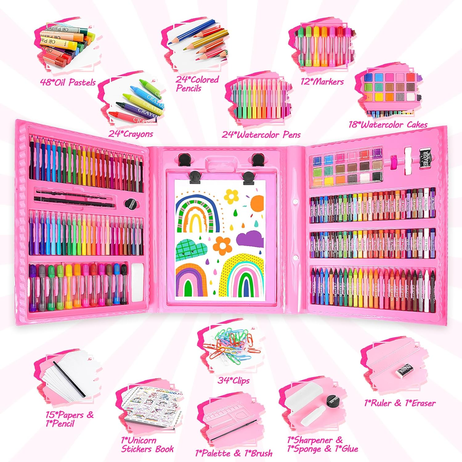 🎨 **SET DE PINTURA PARA NIÑOS:** El juego de pintura de 208 piezas para niños contiene los: Pasteles al óleo * 48, Ceras de colores * 24, Lapices colores * 24, Marcadores * 36, Acuarelas * 18, Clips * 34, Papel de boceto * 15, Libro de pegatinas de unicornio * 1, Lápiz * 1, Sacapuntas * 1, Esponja * 1, Pegamento * 1, Paleta * 1, Pinceles * 1, Regla * 1, Borrador * 1. Para todas sus necesidades de pintura.