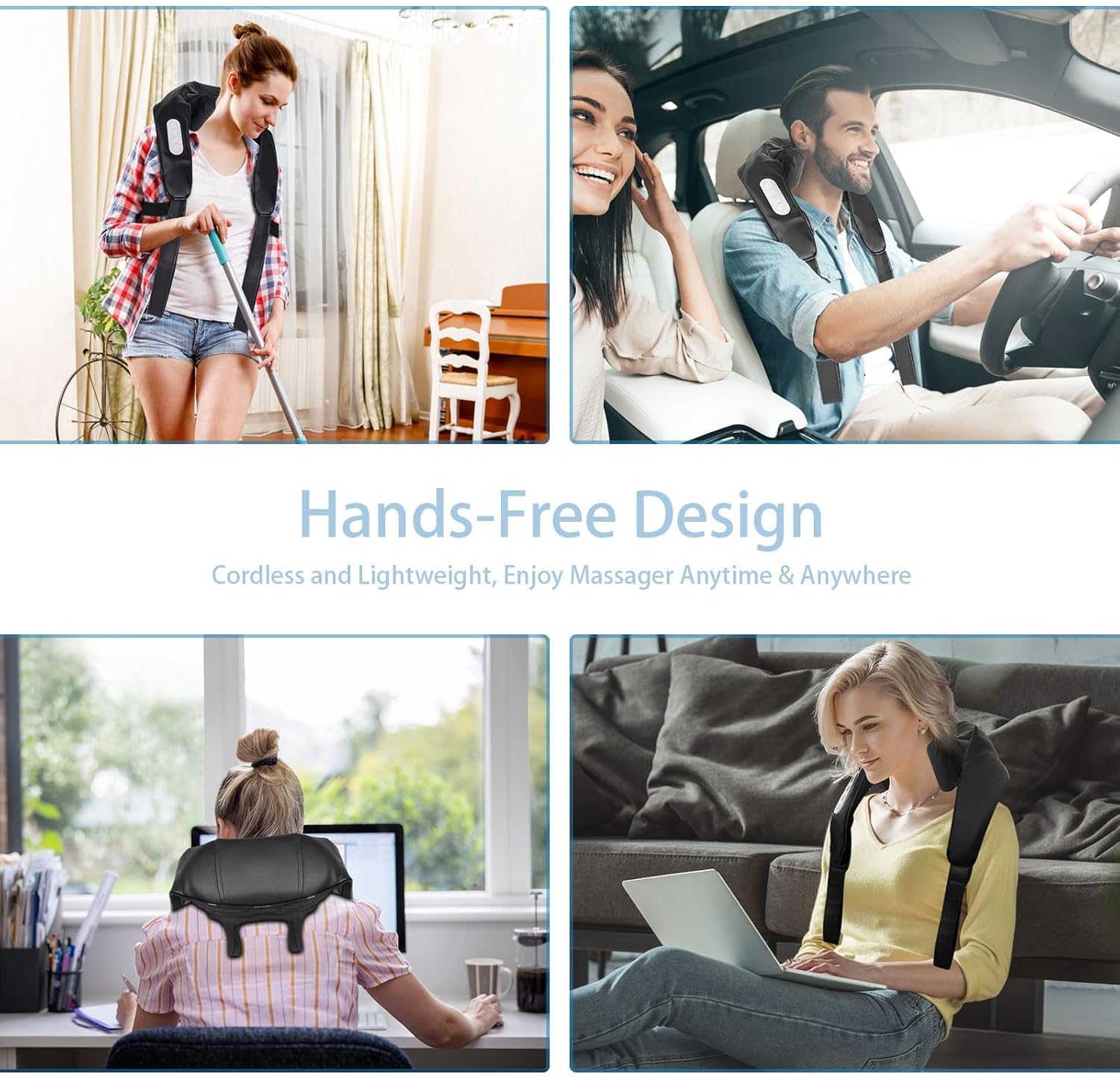 Diseño sin manos: coloque el dispositivo alrededor del cuello y cierre la correa en la parte posterior, de modo que sus manos permanezcan libres durante la relajación. Disfruta de total libertad de movimiento y un masaje ideal. Las correas ajustables garantizan un ajuste perfecto para diferentes tipos de cuerpo.