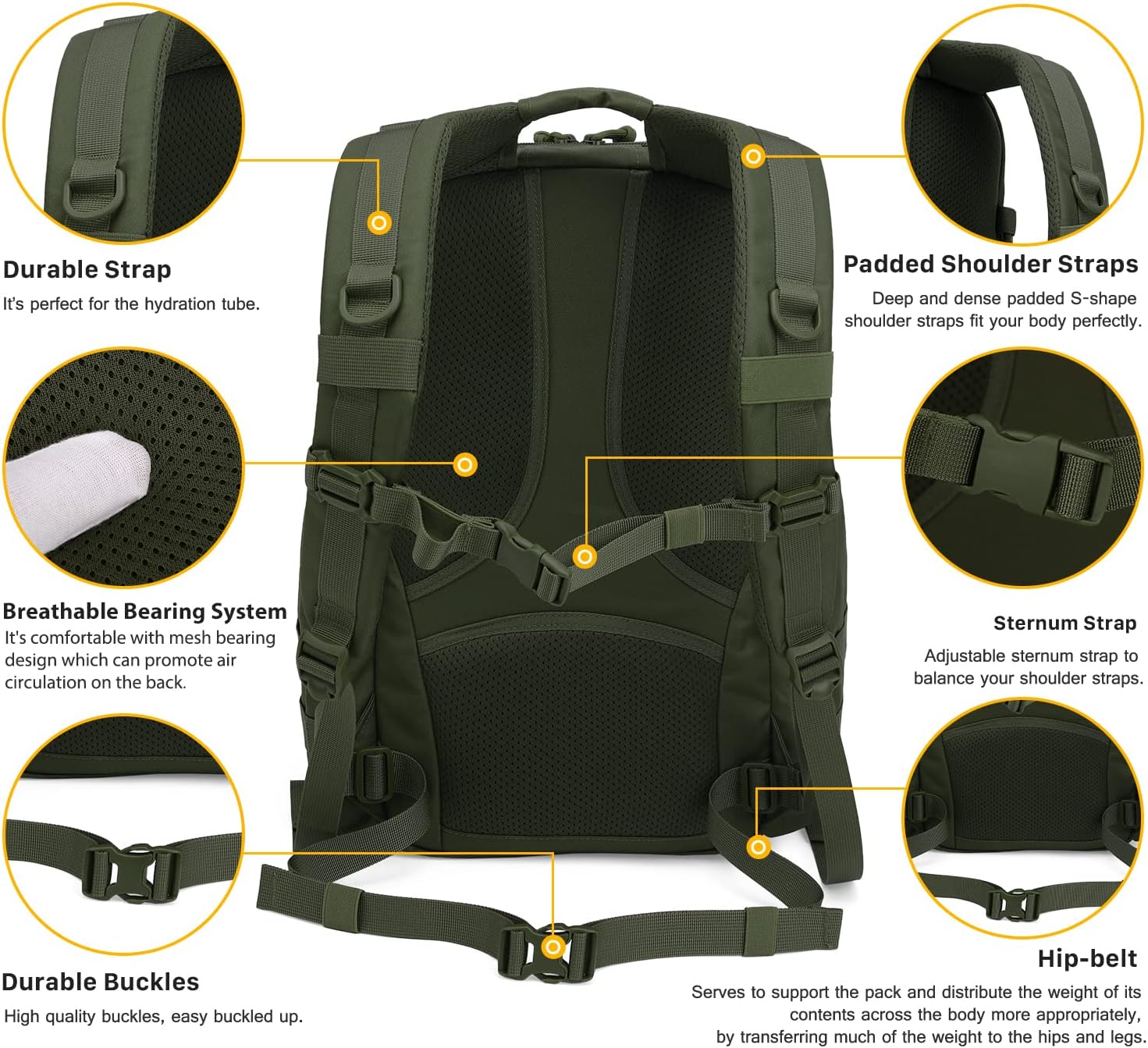 Sistema MOLLE para personalización: Nuestra mochila cuenta con una cincha MOLLE que sujeta de forma segura bolsas o equipos tácticos adicionales. Los múltiples bucles de fijación te permiten personalizar tus opciones de almacenamiento.