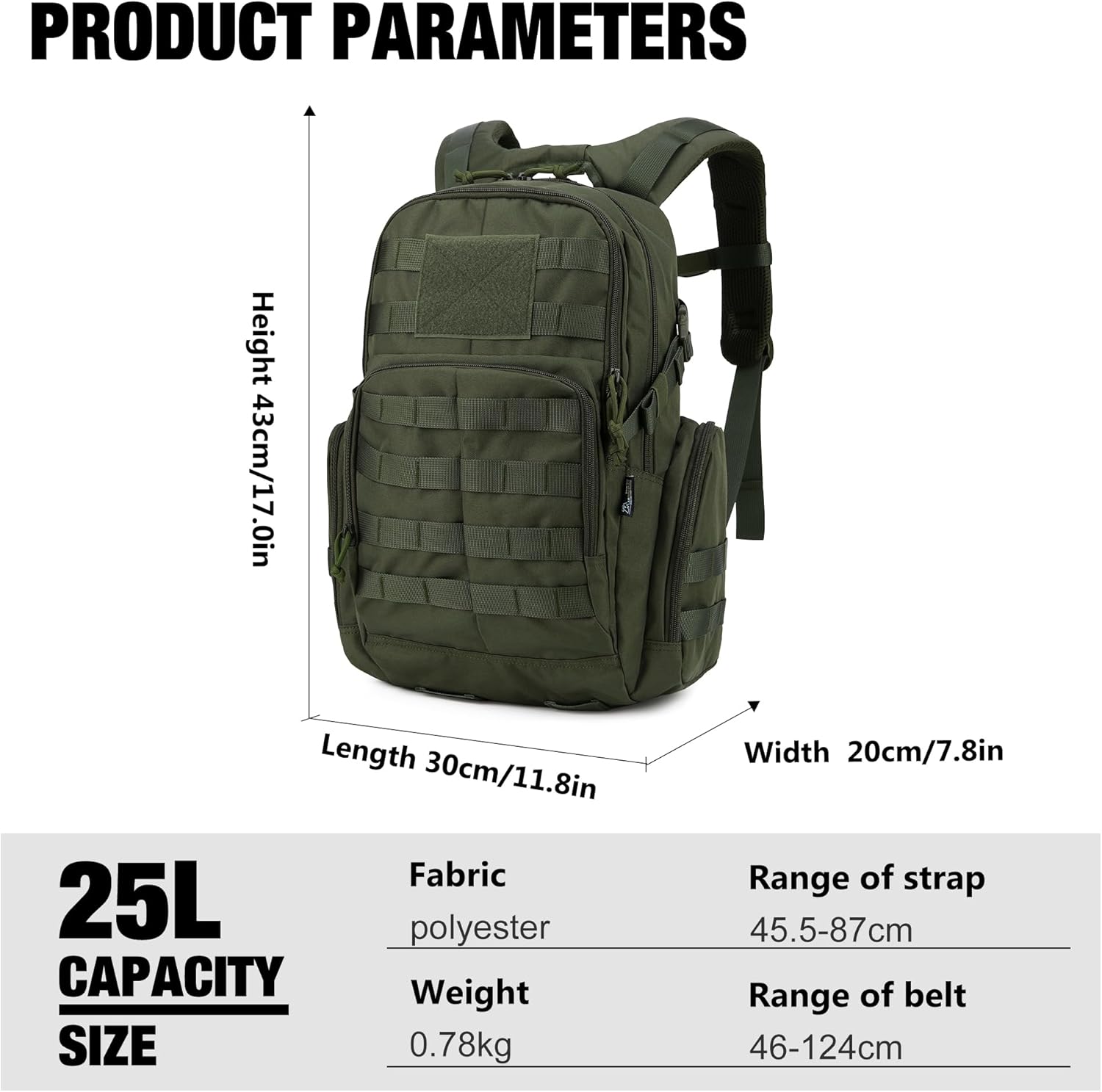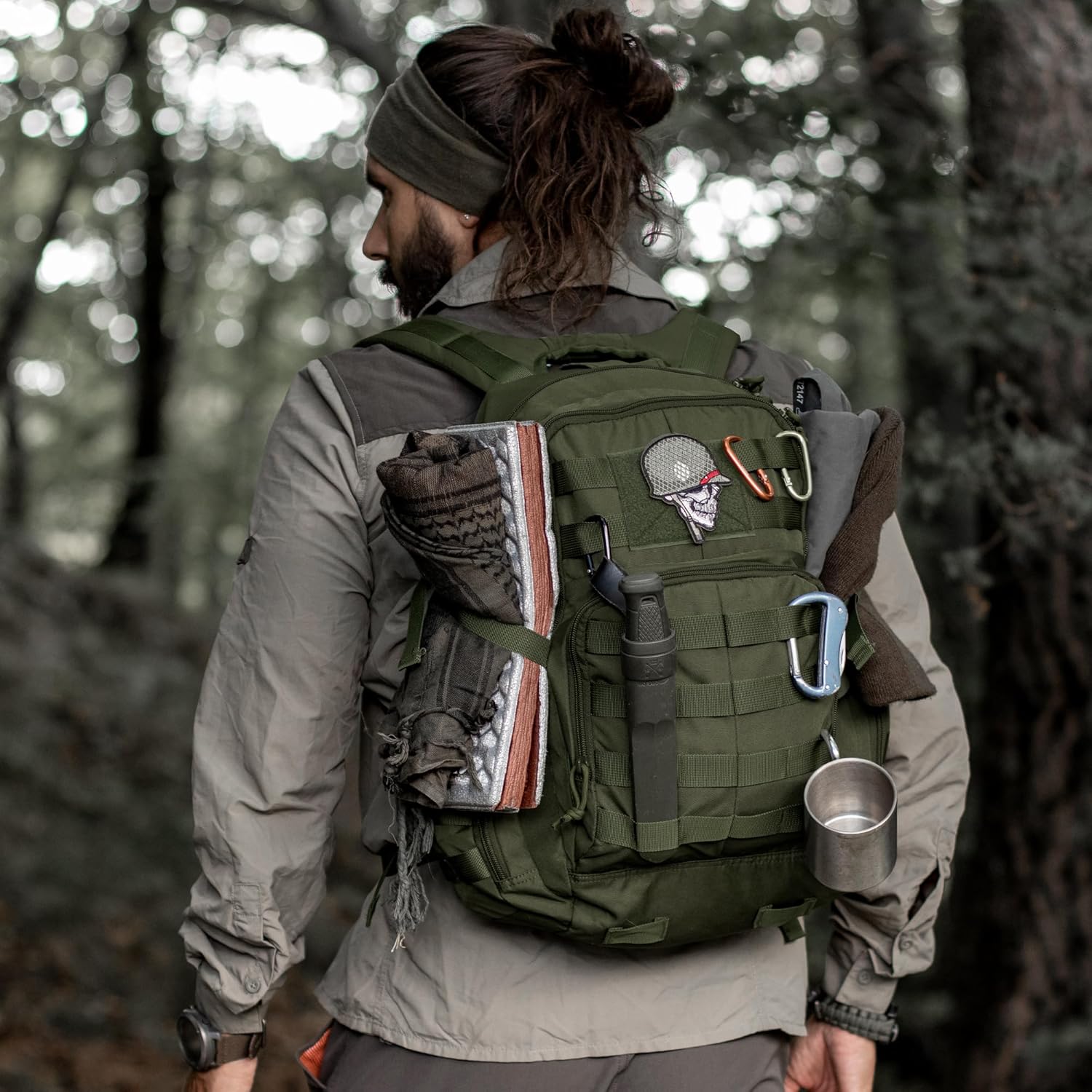 Mochila militar de alta calidad: Nuestra mochila táctica está fabricada con robusto poliéster 600D, por lo que es fácil de limpiar y extremadamente duradera. Con una capacidad de 25 litros, ofrece espacio suficiente para tu equipo militar, material de acampada o equipo de senderismo.
