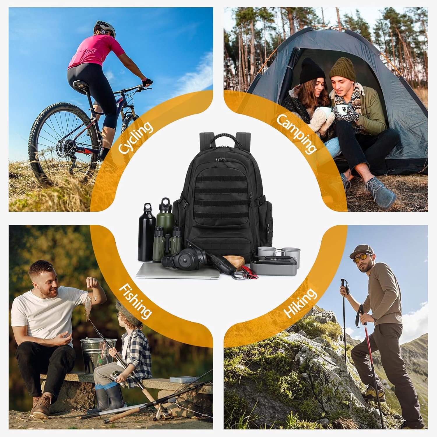 La mochila militar 50L de HUNTVP cuenta con múltiples compartimentos de gran capacidad para guardar equipo de exteriores y también es adecuada para el uso diario. Puede contener una portátil de 17». En la parte delantera hay una zona de decoración amplia donde se puede pegar cualquier parche de su gusto. La parte trasera de la mochila cuenta con correajes para equipaje, lo que facilitará aún más sus viajes largos.