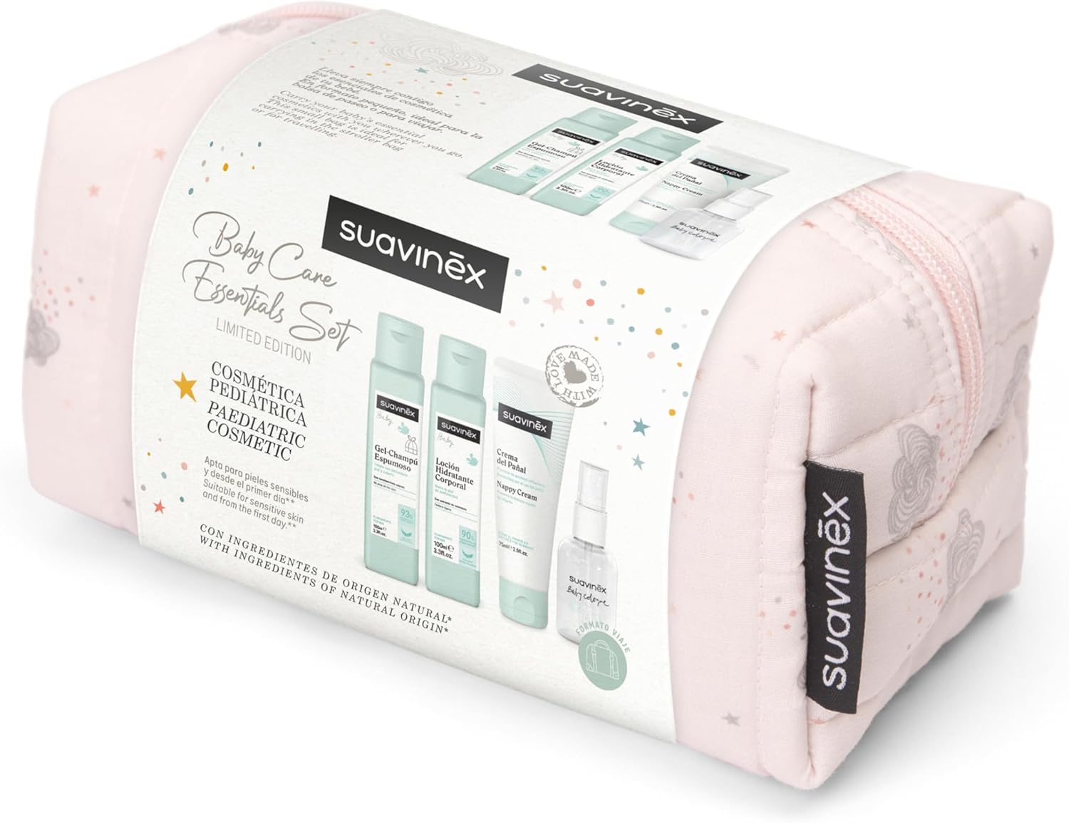 Precioso neceser de tela con productos de cosmética pediátrica en formato viaje. Neceser para bebé de Suavinex, ideal como regalo de recién nacido o como pack para llevar de viaje, al cole, a la guardería o en la maleta del hospital. Reúne todos los productos imprescindibles para el cuidado de tu bebé. Neceser de cosmética para que tu bebé esté siempre limpio y fresquito con nuestros productos de cosmética pediátrica.