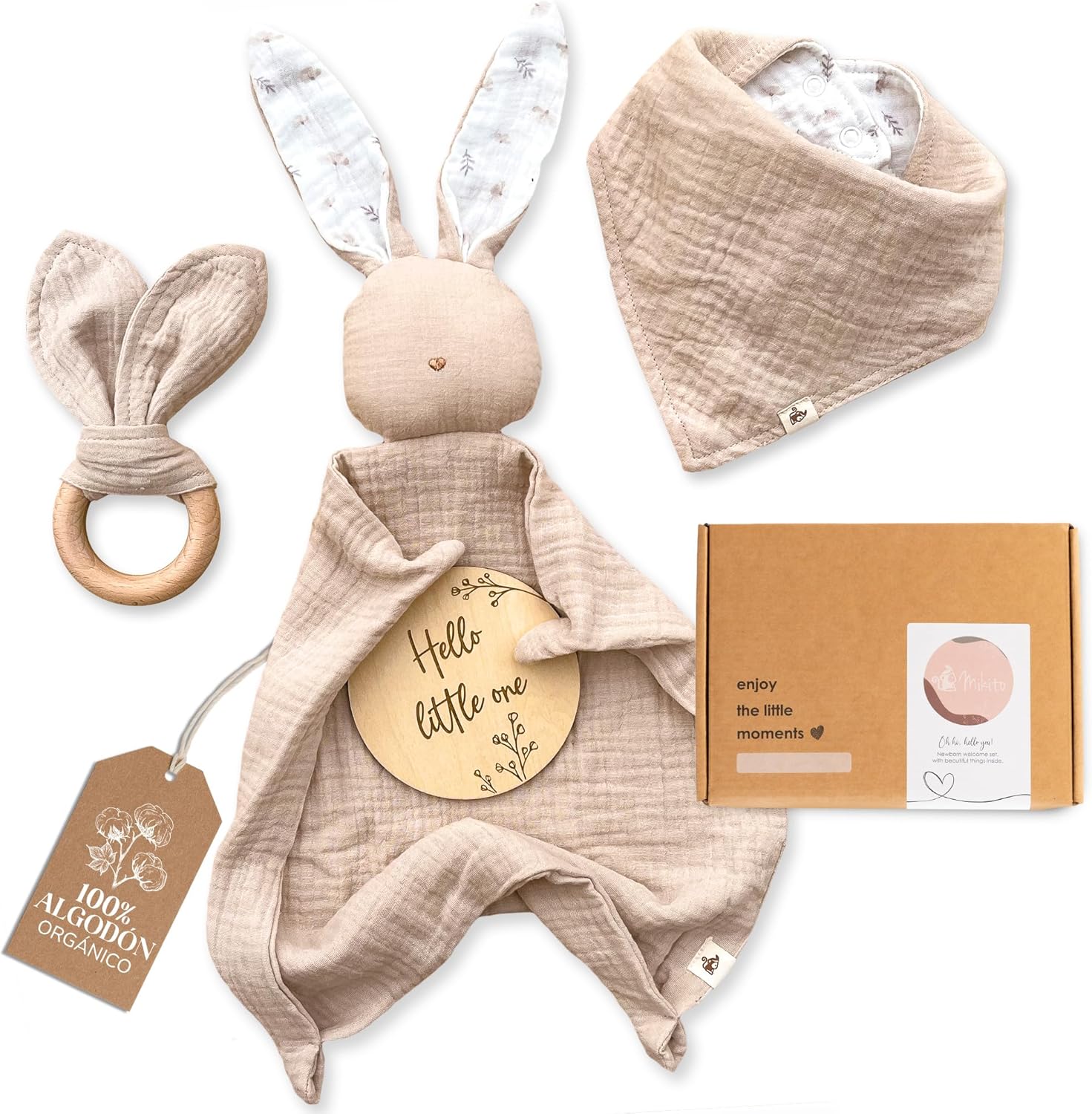 CAJA DE REGALO CON 4 ARTICULOS ÚNICOS – Conejo Dudus bebe – Doble lado babero bebe recien nacido – Mordedor bebe de madera y Tarjeta de bienvenida. ¡Regalo perfecto para cualquier ocasión!