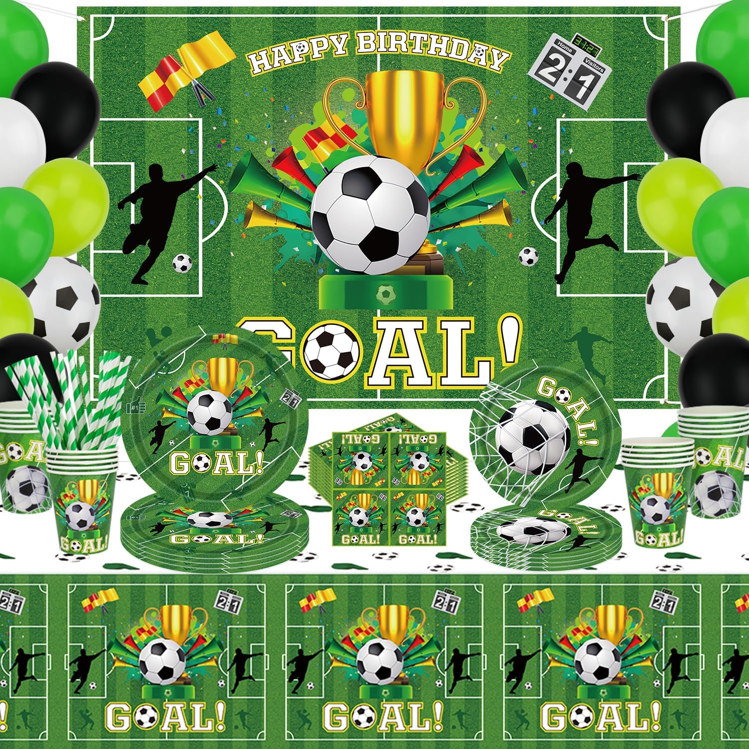 Paquete de 149 suministros de fiesta de fútbol, decoración de cumpleaños temática deportiva, juego de vajilla de fiesta de fútbol, mantel de servilleta, telón de fondo de fútbol para niños, decoración – ¿vale la pena?