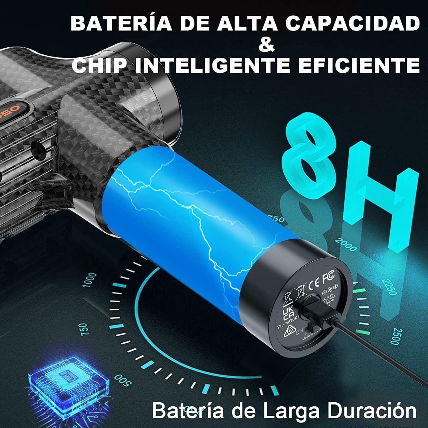 Recargable y portátil: La pistola de masaje de percusión inalámbrica dispone de una batería. Dependiendo del modo utilizado, el tiempo de trabajo puede ser de 6 horas. Viene con una bolsa de transporte que puede contener todos los accesorios.