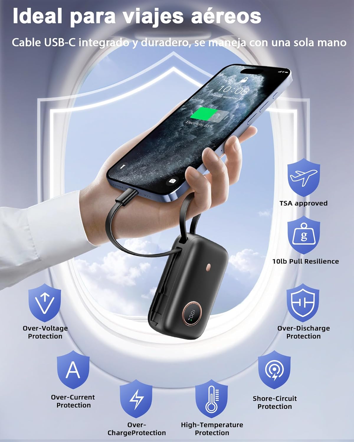 Power Bank con Cable USB-C Integrado: Esta powerbank cuenta con un cable USB-C integrado, por lo que solo necesitas conectar el cable interno para cargar tu teléfono directamente. No es necesario llevar cables adicionales. Es el compañero ideal para salir o viajar. Perfectamente compatible con iPhone 16/15/14/13/12/11 Pro/Max, Xiaomi, Samsung S24/S23/S22/S21, smartwatches y otros dispositivos con carga por USB.