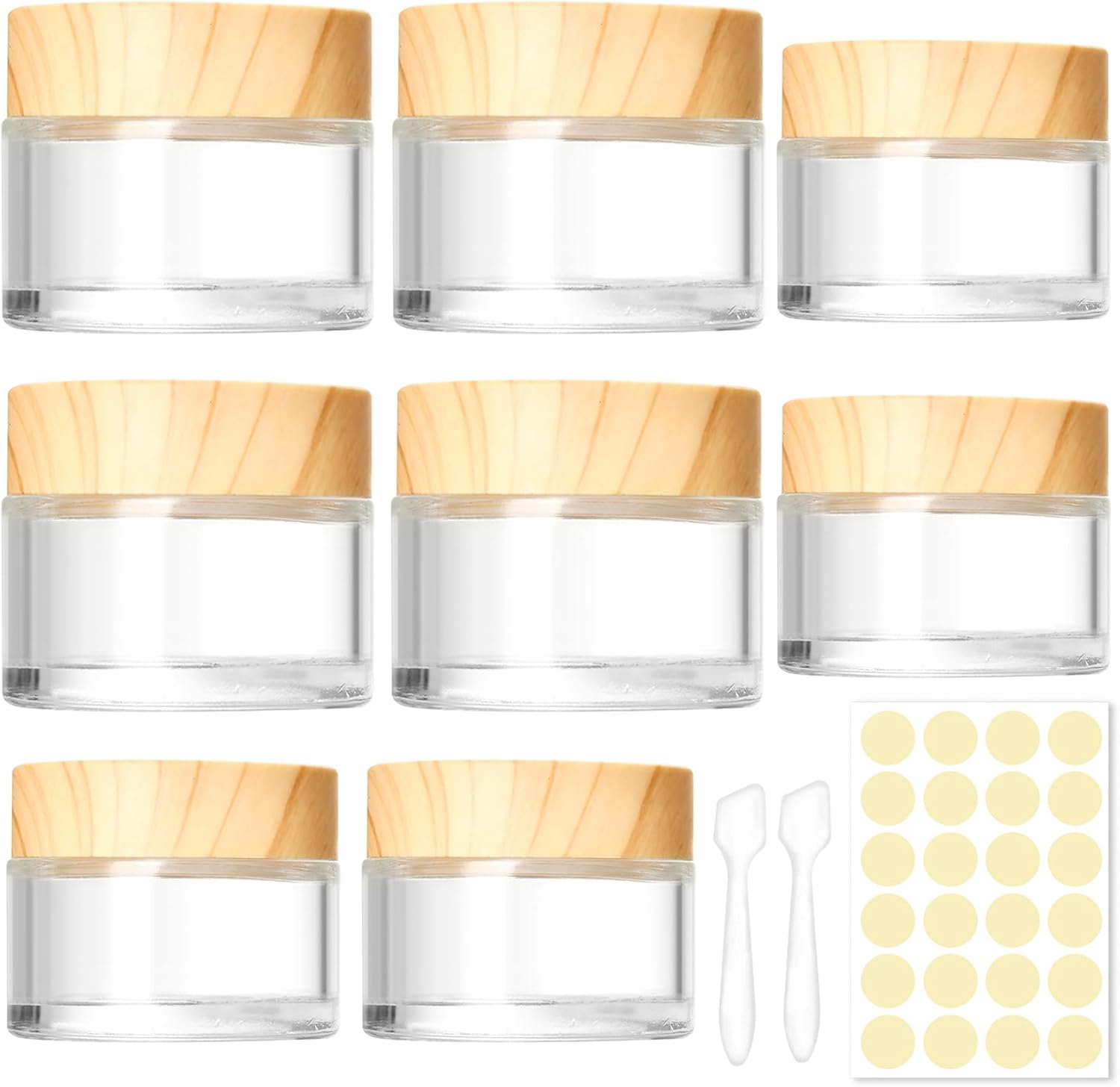 💛【Envases de Tarros de Vidrio】Ofrecemos 8 tarros de vidrio, 2 mini espátulas y 24 pegatinas, 30ml: 5,1*3,9 cm /2*1,5 pulgadas, 50ml: 5,6*5,2 cm / 2,2*2 pulgadas, suficientes para satisfacer sus diferentes necesidades.