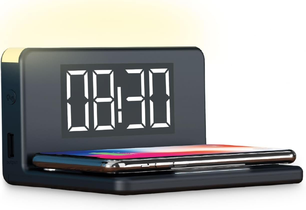 Además de la carga inalámbrica, el reloj cuenta con puertos USB Tipo C y estándar, asegurando que todos los dispositivos estén completamente cargados y listos para usar en todo momento. Con su estilo minimalista y acabado en negro brillante, este reloj despertador digital añade un toque de elegancia y funcionalidad a cualquier dormitorio u oficina.