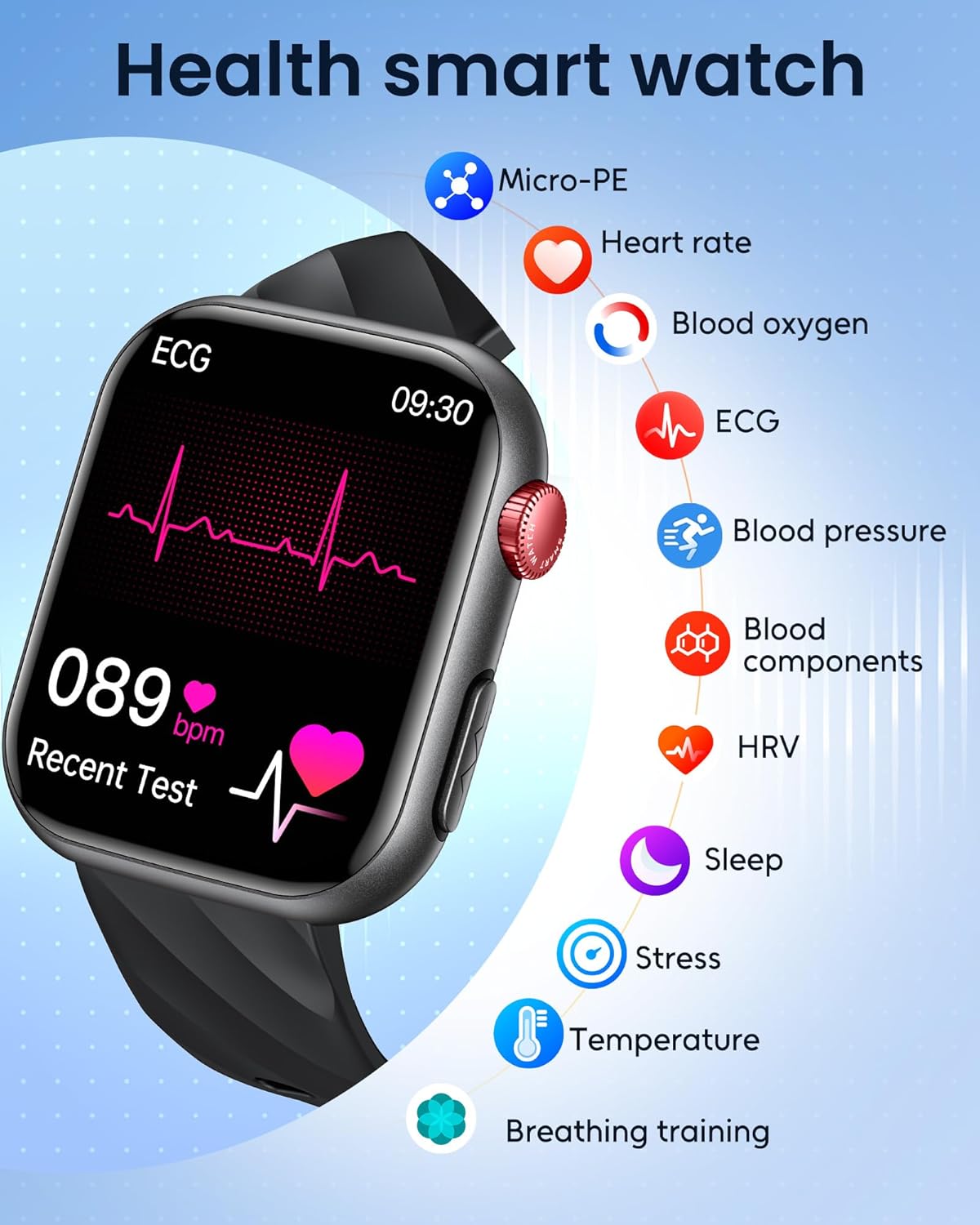 Monitoreo de su salud 24/7: Reloj inteligente de salud para hombres monitorea sus datos físicos en tiempo real 24/7, como presión arterial, oxígeno en sangre, respiración, sueño, presión, 𝐆𝐥𝐮𝐜𝐞𝐦𝐢𝐚 (basta con poner los dedos al lado de los electrodos). Este Reloj hombre puede proporcionar datos completos para ayudarlo a organizar un estilo de vida saludable. El smartwatch hombre puede monitorear los datos en tiempo real como referencia para recordarle cualquier problema de salud.
