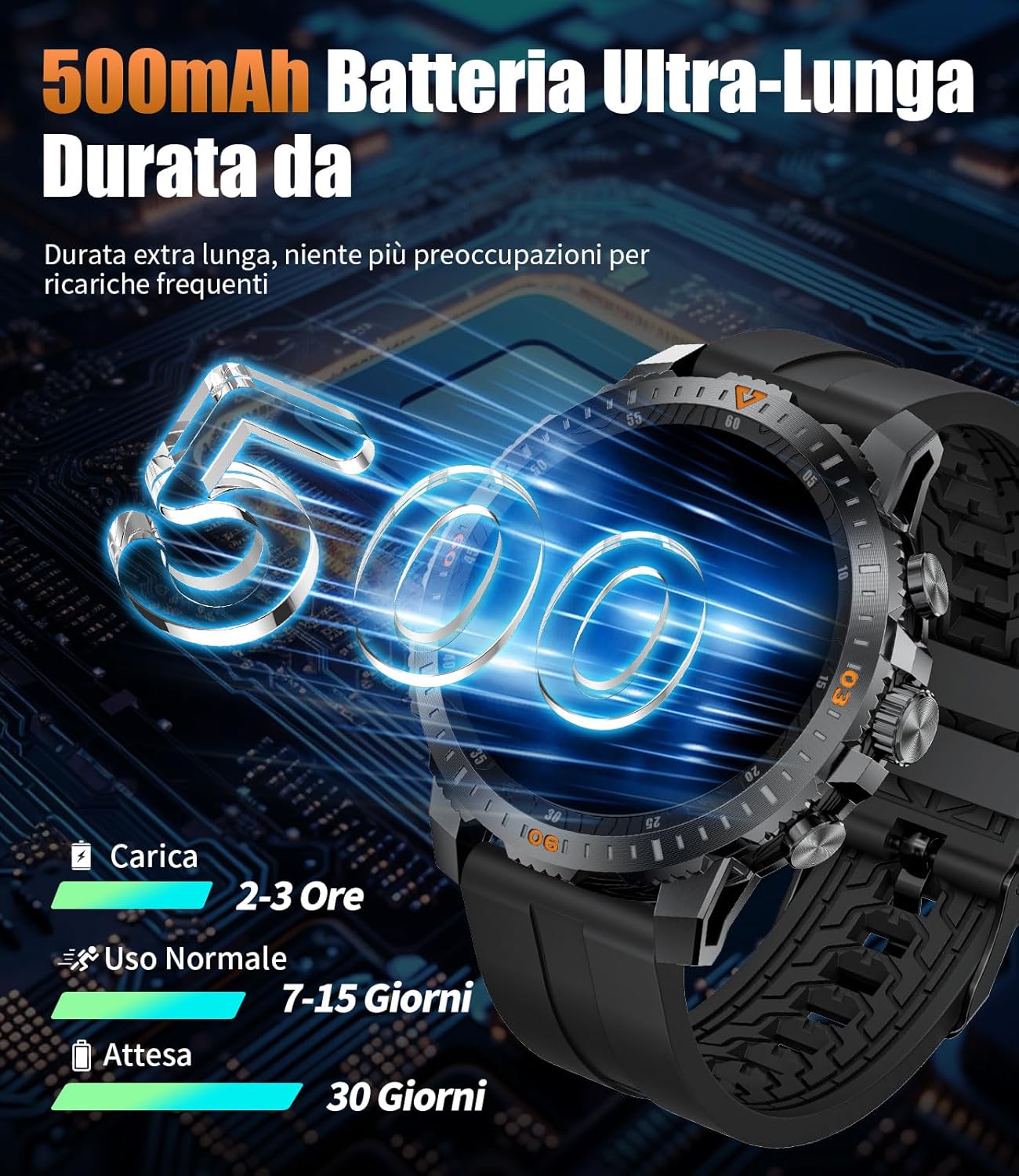 El ESFOE Reloj Inteligente Hombre Militar es un smartwatch de alta calidad con una pantalla AMOLED de 1.43 pulgadas que ofrece una visibilidad excepcional incluso bajo la luz solar directa. Con una caja de titanio TC4 y resistencia al agua IP68, este reloj es duradero y adecuado para deportes al aire libre y entornos extremos. Con una batería de polímero de litio de 500 mAh, este smartwatch tiene una duración de hasta 60 días en modo de espera y de 6 a 15 días con uso normal. Ofrece más de 100 modos deportivos, monitoreo de la salud las 24 horas y la capacidad de realizar y recibir llamadas Bluetooth y notificaciones de alerta.