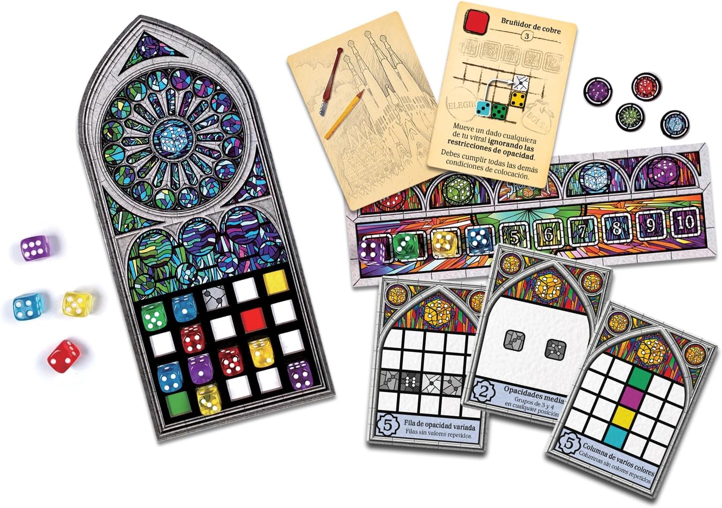 Sagrada es un juego de mesa de lanzamiento de dados y creación de secuencias para la construcción de ventanas de colores