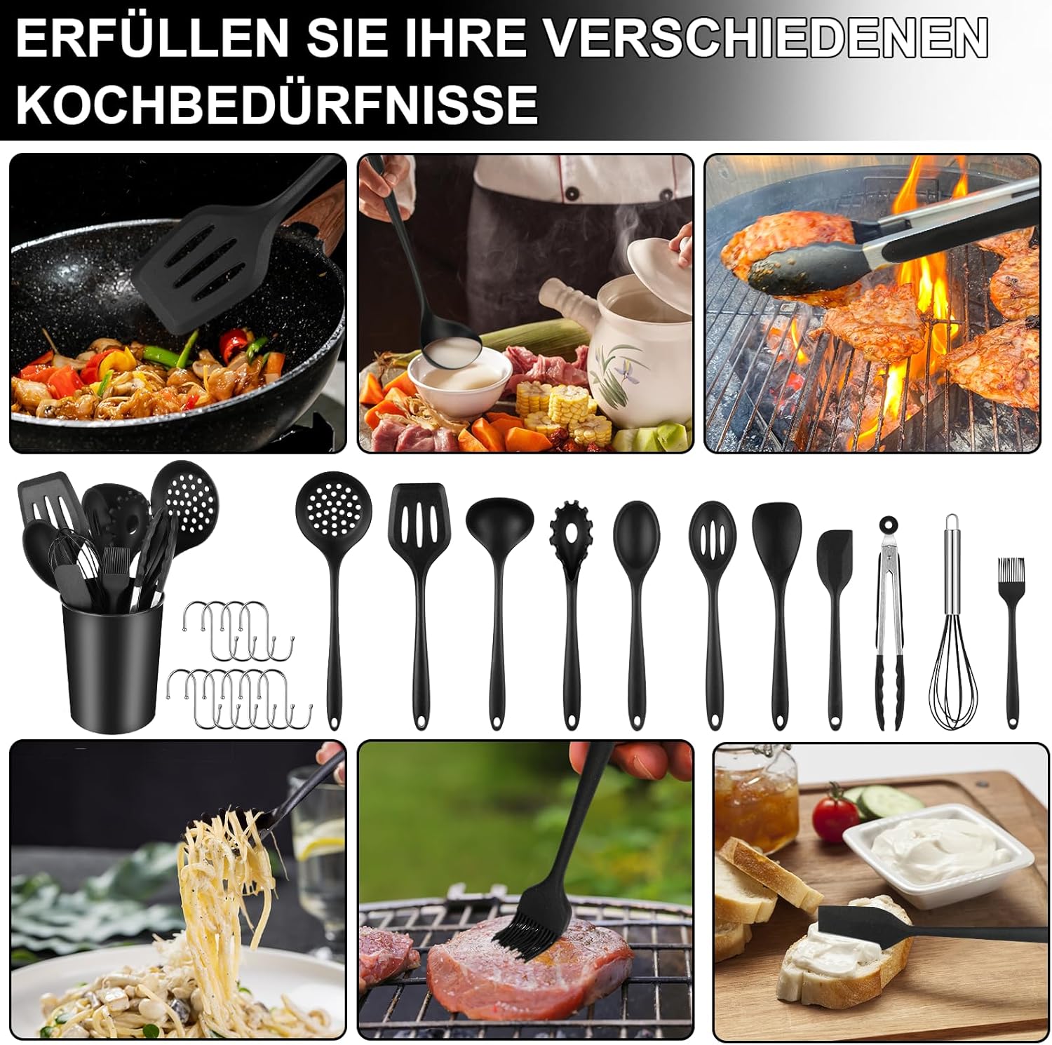 [Práctico juego]: el juego de utensilios de cocina de silicona profesional de 22 piezas incluye una variedad de utensilios de cocina, como 1 cuchara de espuma, 1 espátula ranurada, 1 cucharón, 1 servidor de pasta, 1 espátula para ensalada, 1 cuchara ranurada, 1 espátula, 1 batidor, 1 pinzas, 1 cepillo, 1 x cepillo, 1 x x soporte para utensilios y Incluye 10 ganchos para un almacenamiento conveniente.