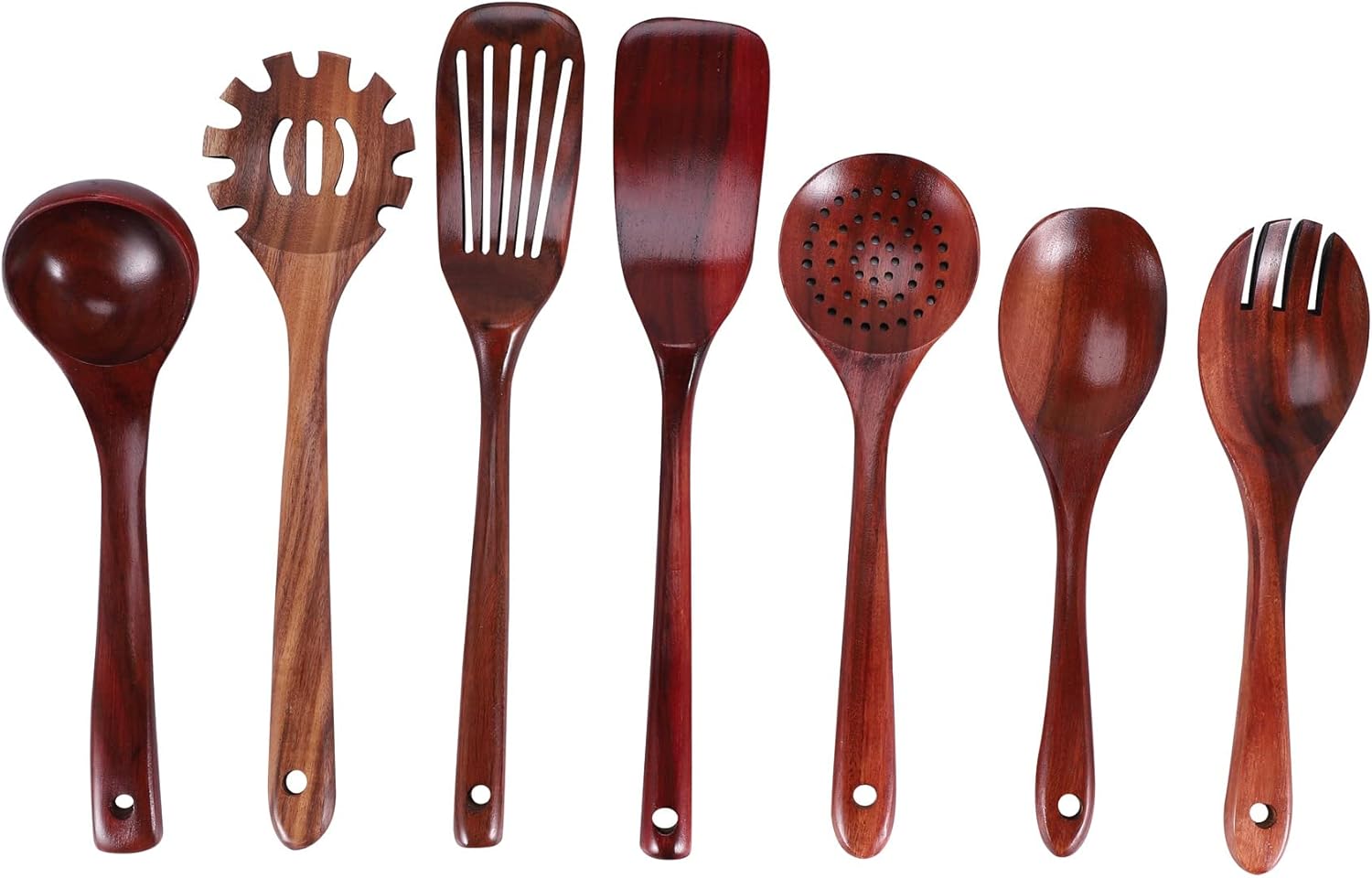 El juego de utensilios de cocina de madera Ksrnsne viene en un set de 7 piezas que incluyen una cuchara para ensalada, cuchara ranurada, tenedor para ensalada, espátula frita, espátula ranurada, cucharón para sopa y servidor de espagueti. Están hechos de madera de teca sólida de una pieza, con un diseño ergonómico que los hace fáciles de usar y duraderos. Son resistentes al calor y no rayarán los utensilios de cocina antiadherentes.