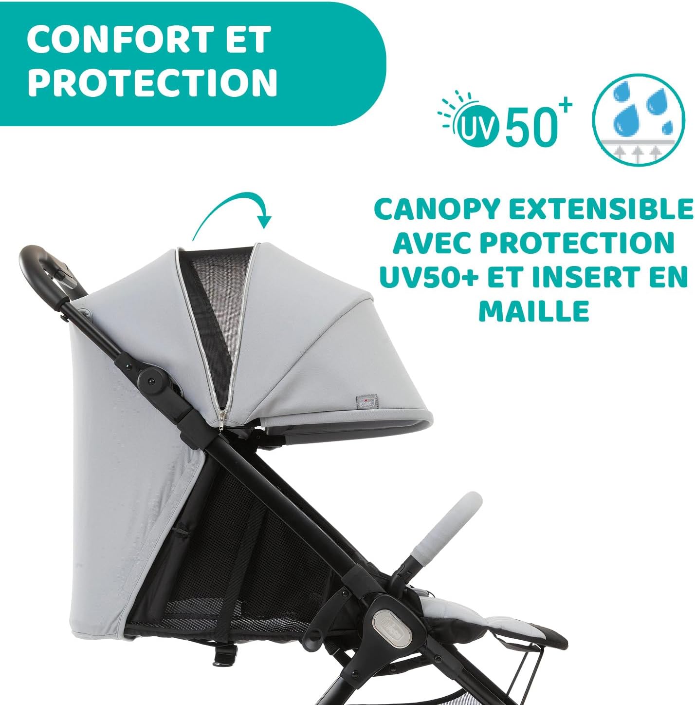 La Chicco WE viene equipada con una capota extensible que protege al bebé del sol y la lluvia, asegurando su comodidad en todo momento. Además, incluye una bolsa de viaje para facilitar su transporte y almacenamiento.
