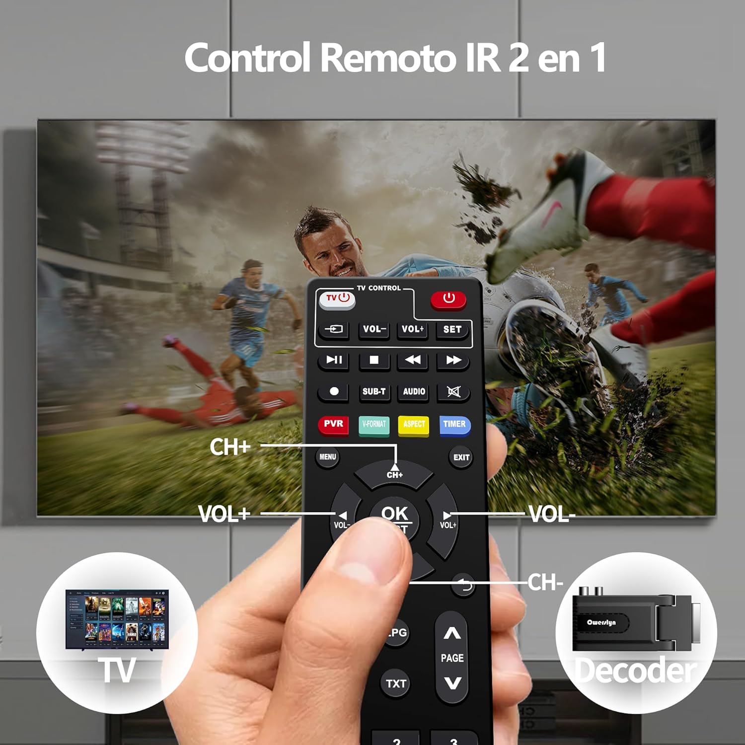 El receptor TDT HD viene con un control remoto 2 en 1 que puede controlar tanto el receptor como tu televisor. Esto elimina la necesidad de tener varios controles remotos y simplifica tu experiencia al ver televisión. Aunque solo admite mando a distancia por infrarrojos, cuenta con 4 teclas programables (ON/OFF, AV/TV, VOL-, VOL+).