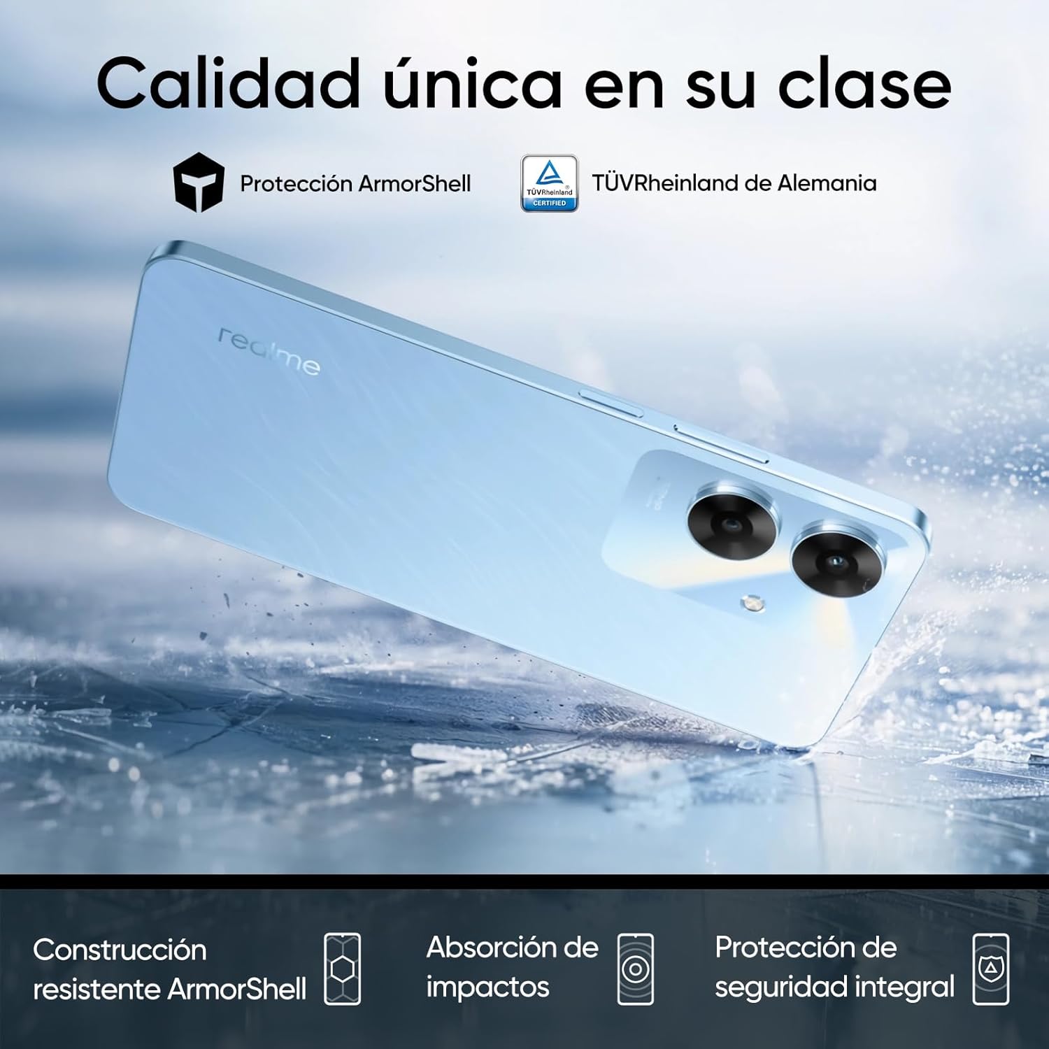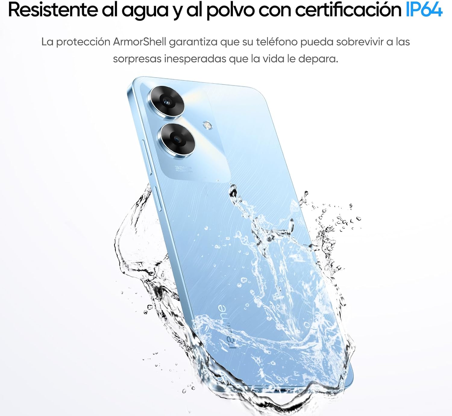 El **realme Note 60 Smartphone** cuenta con un diseño atractivo y resistente, con protección ArmorShell Tough Body que lo hace altamente duradero. Además, es resistente al agua y al polvo con certificación IP64.
