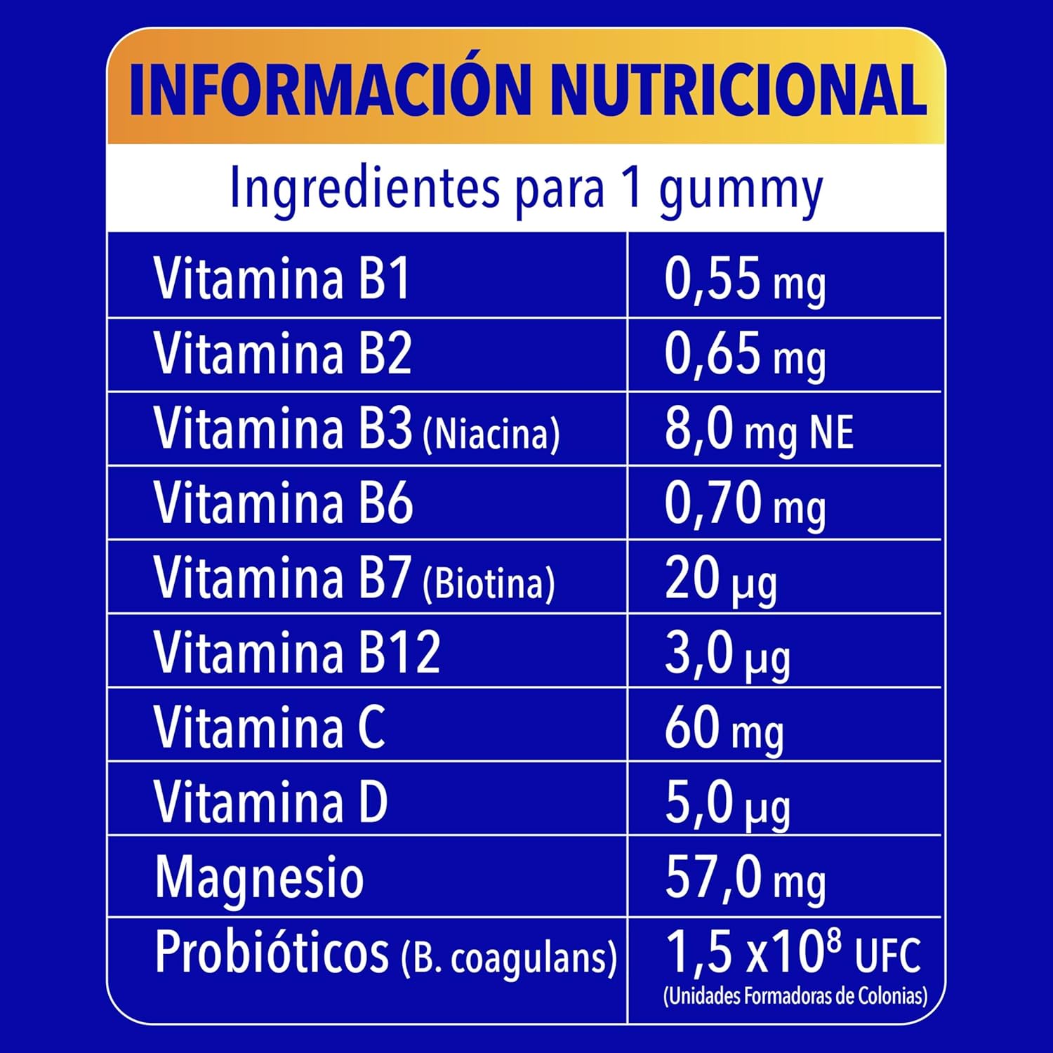 Cada deliciosa gummy, con sabor a naranja, contiene 8 vitaminas esenciales, incluyendo Vitaminas B1, B2, B3, B6, B7 y B12 para ayudar al metabolismo energético, así como Vitamina C y Magnesio para ayudar a reducir el cansancio y la fatiga¹.
