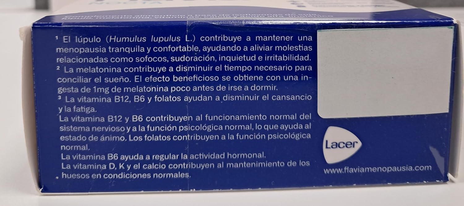 Flavia Nocta es un complemento alimenticio que ayuda a aliviar los signos molestos de la menopausia. El lúpulo (Humulus Lupulis L.) contribuye a mantener una menopausia tranquila y confortable, ayudando a aliviar molestias relacionadas como sofocos, sudoración, inquietud e irritabilidad. La melatonina contribuye a disminuir el tiempo necesario para conciliar el sueño. El efecto beneficioso se obtiene con una ingesta de 1 mg de melatonina poco antes de irse a dormir. La vitamina B12, B6 y folatos ayudan a disminuir el cansancio y la fatiga. Las vitaminas B12 y B6 contribuyen al funcionamiento normal del sistema nervioso y a la función psicológica normal, lo que ayuda al estado de ánimo. Los folatos contribuyen a la función psicológica normal. La vitamina B6 ayuda a regular la actividad hormonal. La vitamina D, K y el calcio contribuyen al mantenimiento de los huesos en condiciones normales.