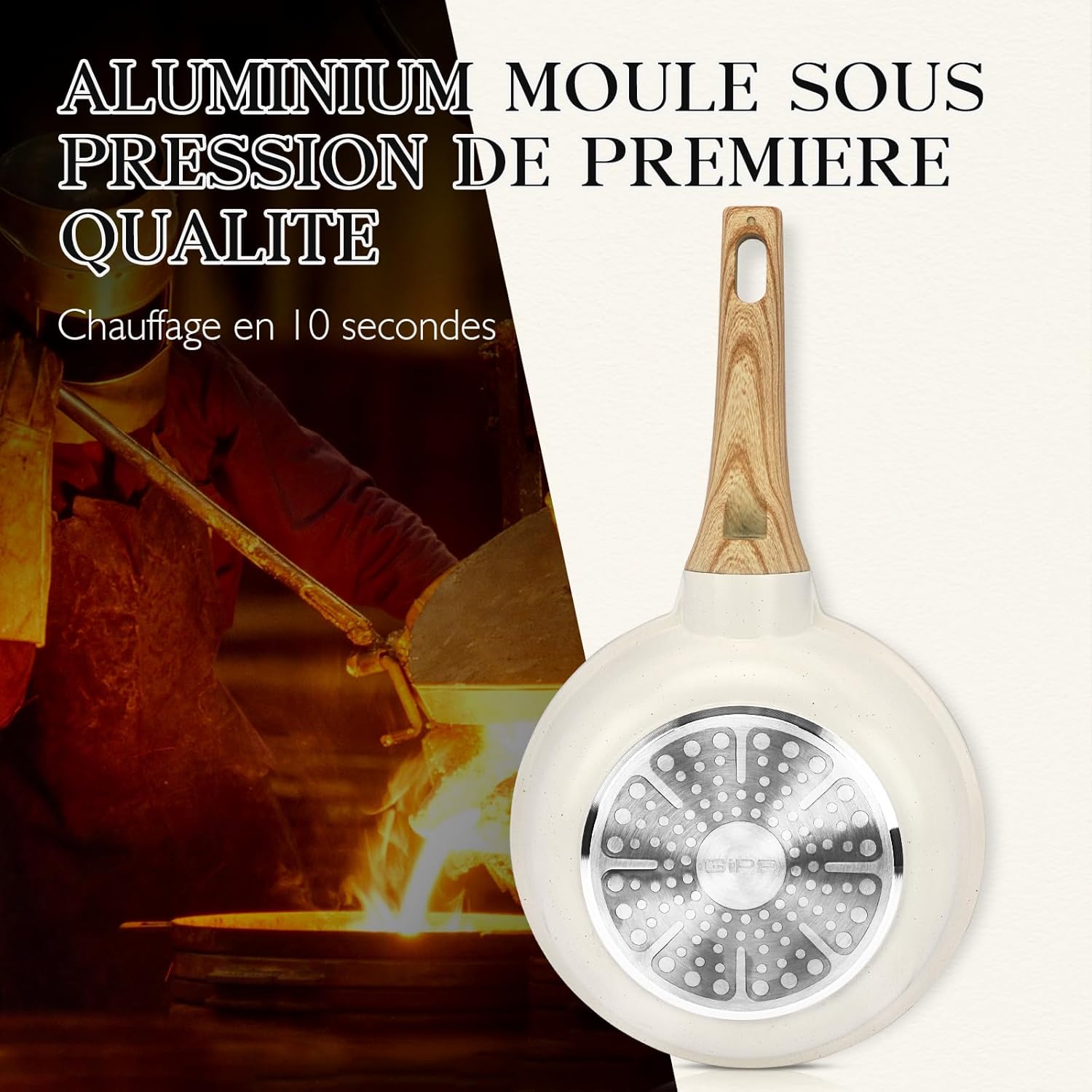 Mango de ergonomía y base de calentamiento rápido: el mango de novolak ergonómico proporciona un agarre cómodo y un buen aislamiento térmico. La base de acero inoxidable con patrón es adecuada para todas las cocinas, y el calentamiento es rápido y uniforme.